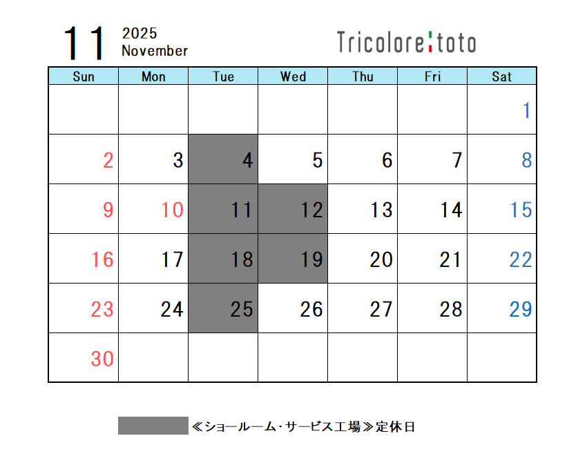 当ショールームにおける11月の定休日をご案内いたします。