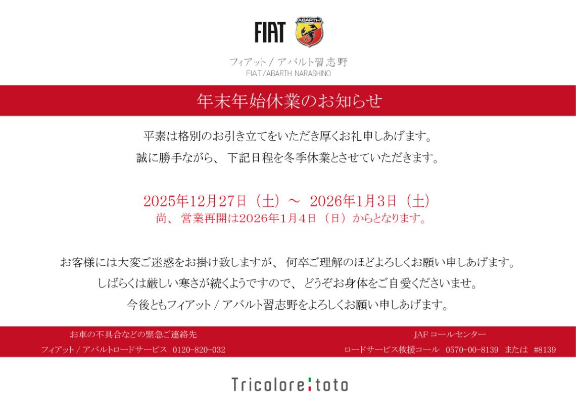 フィアット/アバルト習志野では以下の期間中を年末年始休業とさせていただきます。